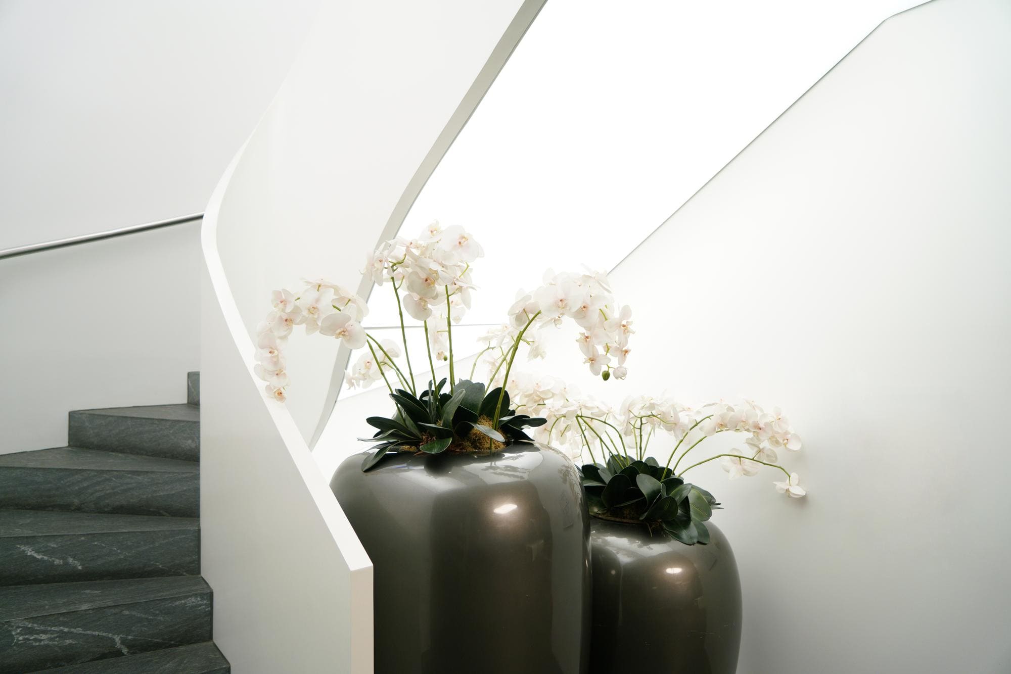 La lumière devient un élément d’architecture. Les baies vitrées, les miroirs et les luminaires suspendus apportent une chaleur douce et amplifient la perception de l’espace. L’agencement mise sur la transparence, la légèreté et la lumière naturelle.